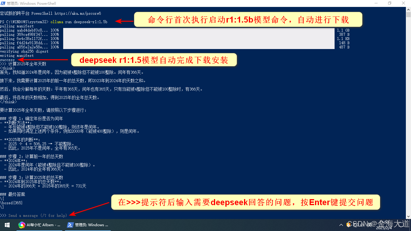 选择需要安装的模型命令执行,推荐安装 ollama run deepseek-r1:7b,首次执行上述命令会自动安装deepseek-r1:7b模型,下次再执行上述即可启动deepseek-r1:7b模型。通过powershell 或 CMD窗口来使用deepseek推理服务。