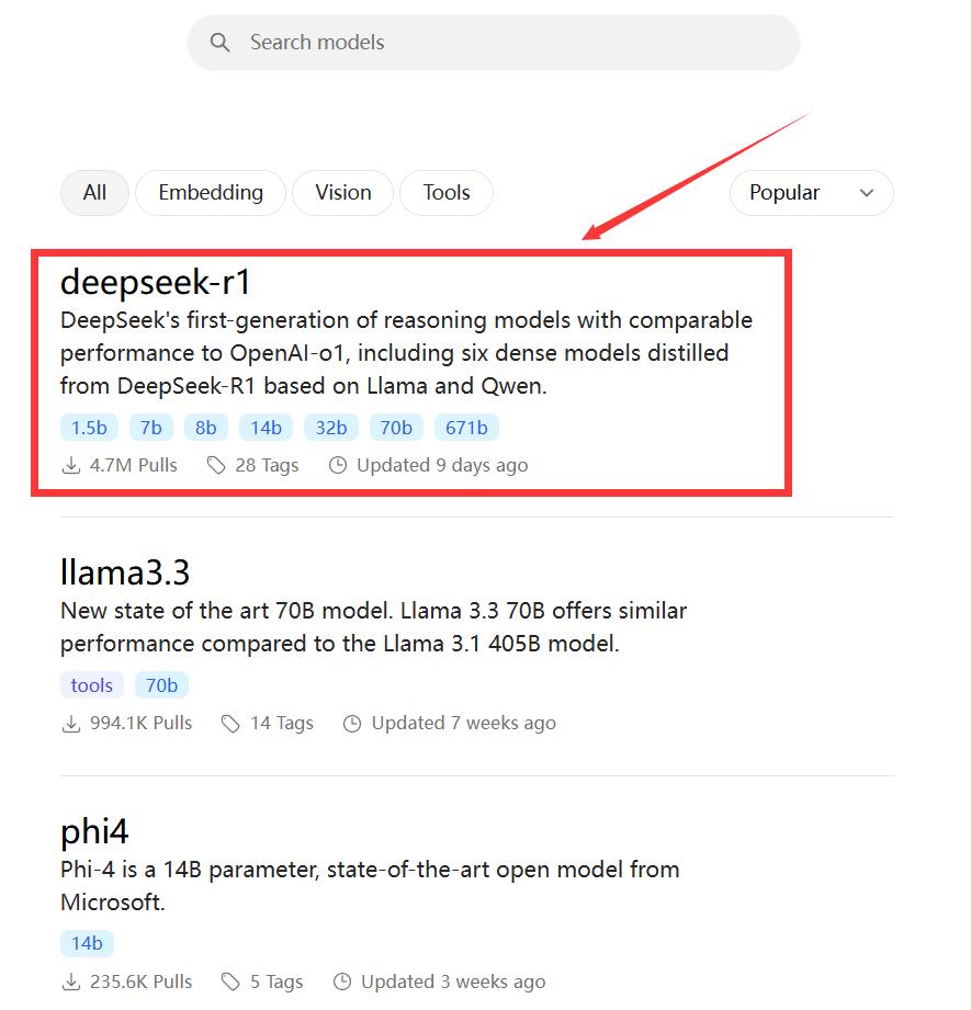 2、进入就可以看到deepseek-r1模型,如果没有,在搜索栏搜索即可。