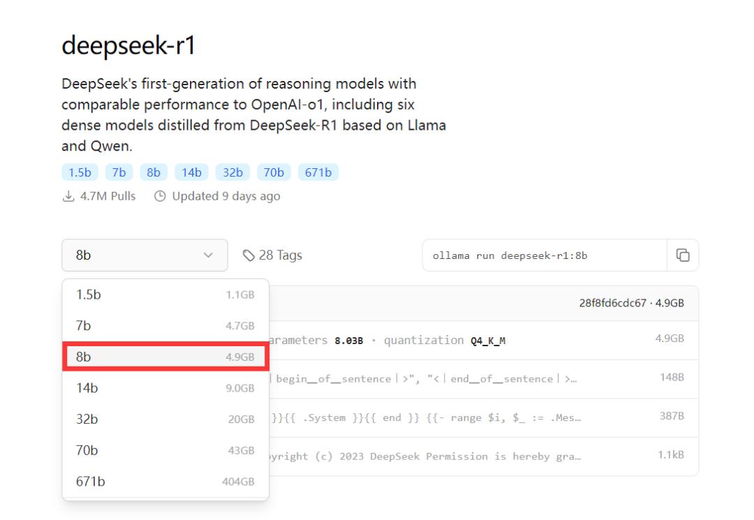 3、选择对应的模型来下载,1.5b、7b、8b、14b、32b、70b或671b,这里有很多版本可选,模型越大,要求电脑内存、显卡等的配置越高。老宅这台机子是4060的显卡,选择8b的模型。