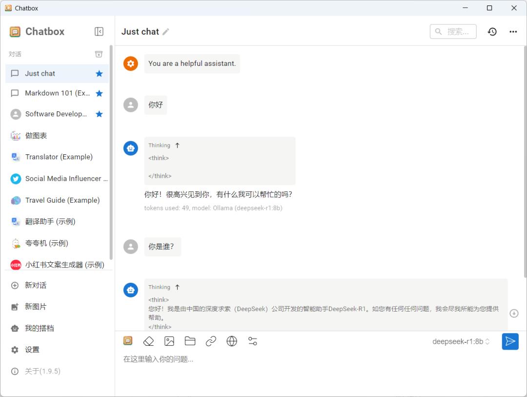 通过第二步的操作,已经部署好DeepSeek,但每次使用都要在终端管理员里操作,相当繁琐。这里可以借助Chatbox,实现网页或客户端操作。