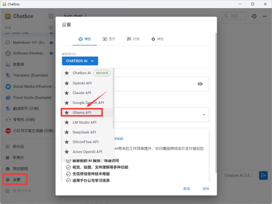 2、点击设置,选择Ollama API