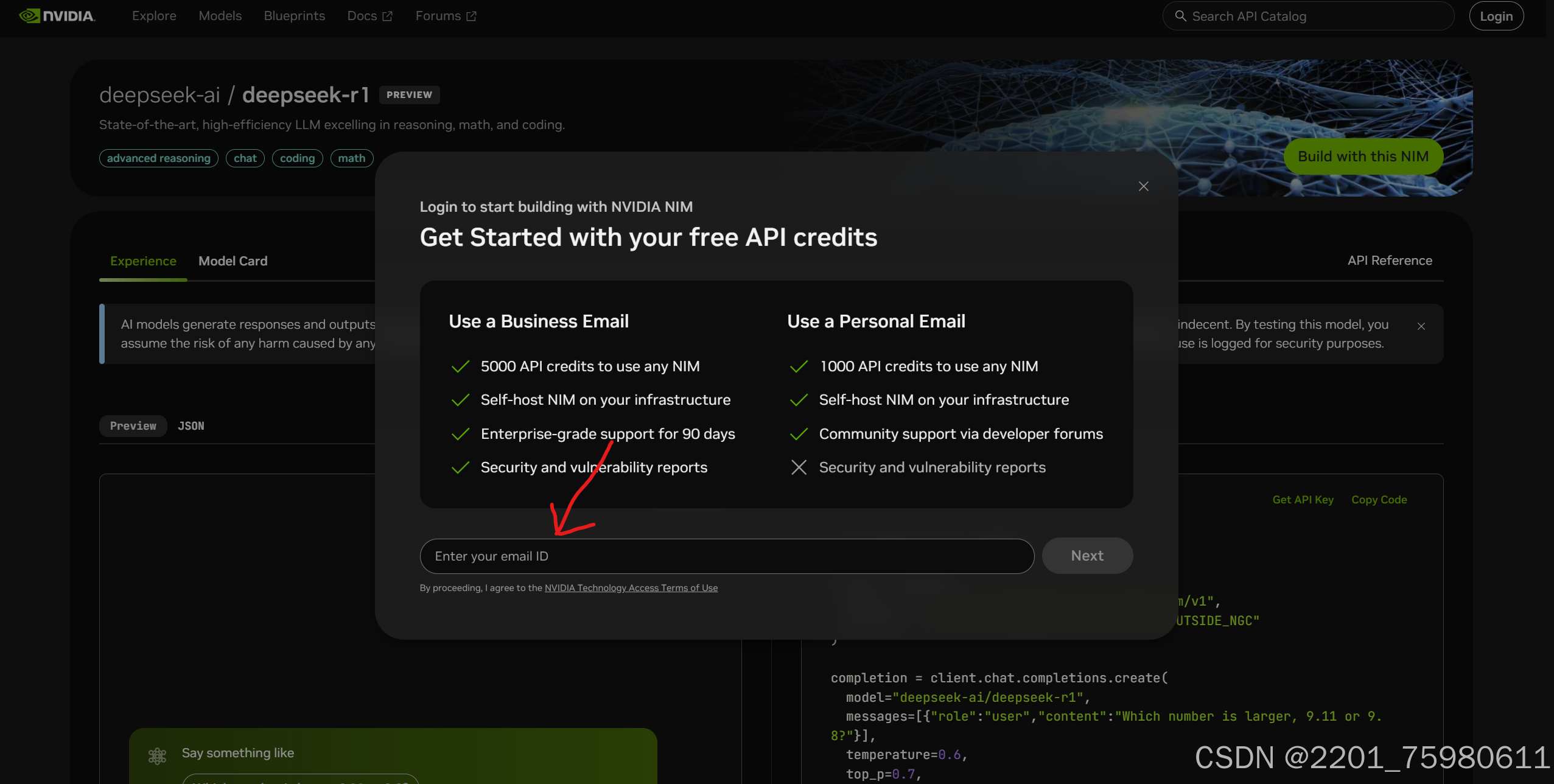 输入完后点击Next进入下一步,然后登录你的账号(没有账号可以直接注册),登录完后回到刚开始点击deepseek-r1进入的页面,再点击一次Get API Key,点击Generate Key生成密钥,点击后会有个弹窗,上面已经自动给你生成好密钥,直接点击右下角的Copy Key直接复制就行。