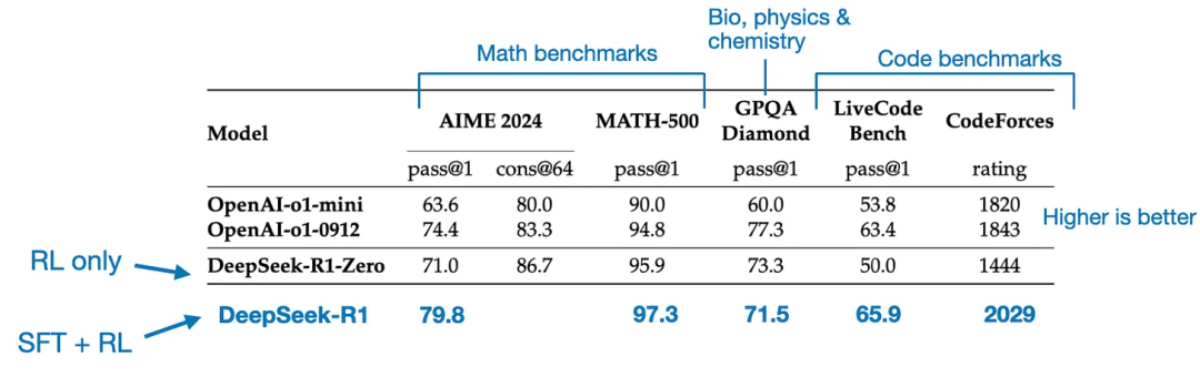 最终生成的模型——DeepSeek-R1,通过额外的 SFT 和 RL 阶段,在性能上相较于 DeepSeek-R1-Zero 有了显著提升,具体表现可以参考下表的数据对比。