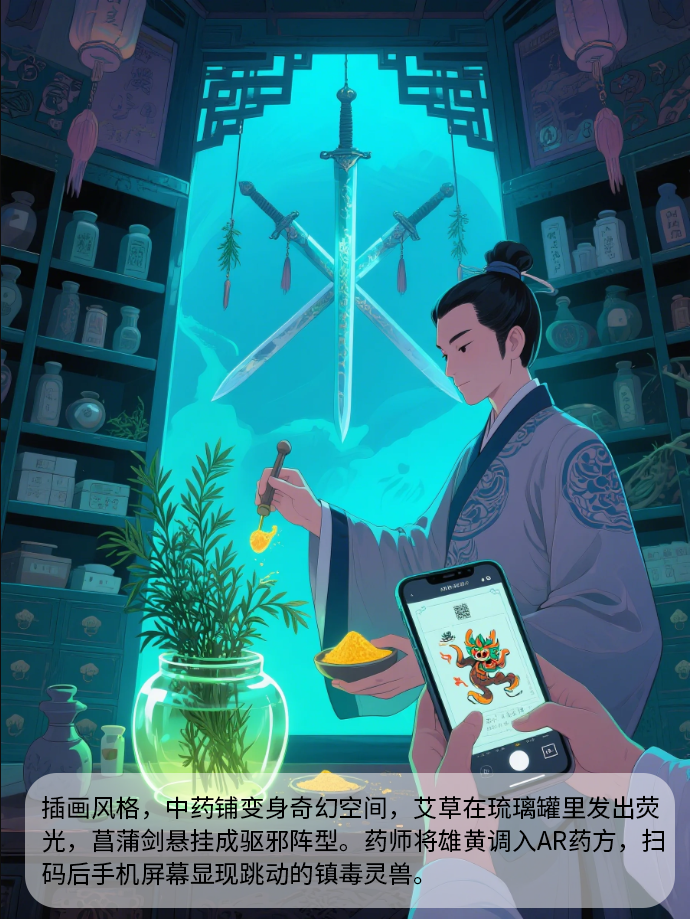 插画风格,中药铺变身奇幻空间,艾草在琉璃罐里发出荧光,菖蒲剑悬挂成驱邪阵型。药师将雄黄调入AR药方,扫码后手机屏幕显现跳动的镇毒灵兽。