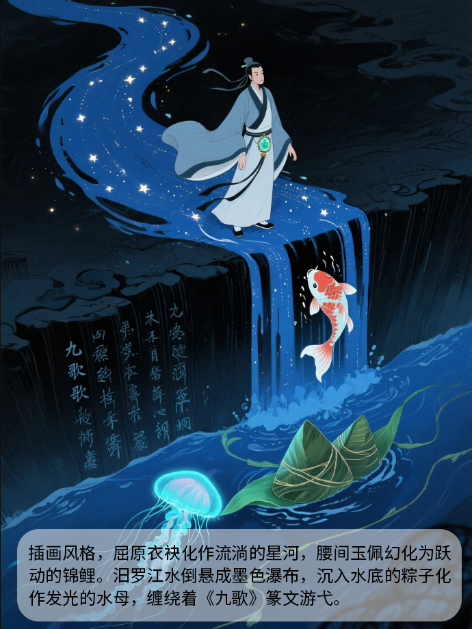 插画风格,屈原衣袂化作流淌的星河,腰间玉佩幻化为跃动的锦鲤。汨罗江水倒悬成墨色瀑布,沉入水底的粽子化作发光的水母,缠绕着《九歌》篆文游弋。