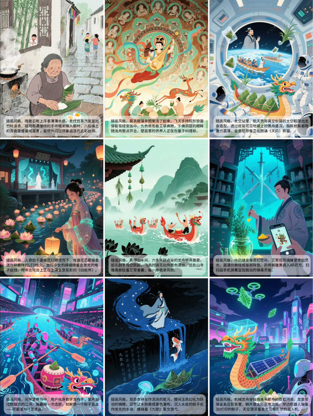 插画风格,莫高窟藻井图案活了起来,飞天手持粽形箜篌穿梭在经变画中。九色鹿衔着艾草奔跑,千佛洞窟的眼眸随龙舟鼓点开合,壁画里的供养人正在包量子纠缠粽。