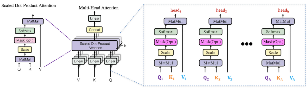 多头注意力:多个注意力头并行操作,每个头专注于输入的不同方面。它们的输出被连接并转换,从而实现更丰富的上下文表示。