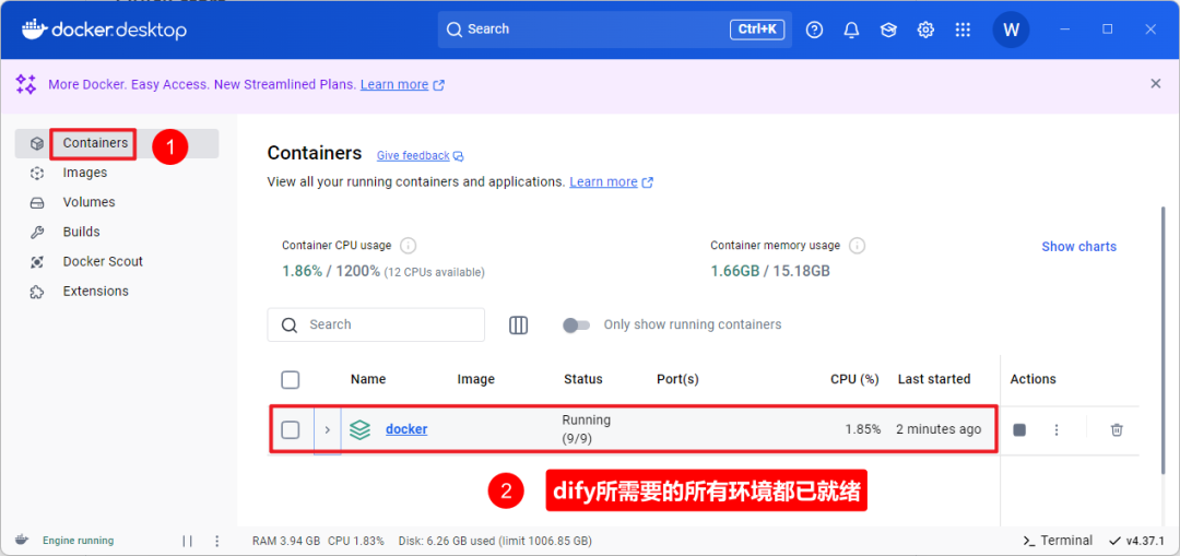 此时回到docker桌面客户端可看到,所有dify所需要的环境都已经运行起来了