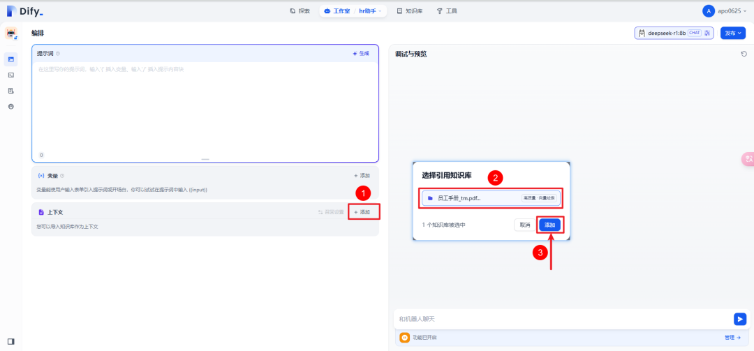 这表明,dify与本地部署的大模型deepseek-r1连通了,但是,我想让他的回答是基于我的私有知识库作为上下文来和我聊天怎么办?这就需要用到本地知识库了