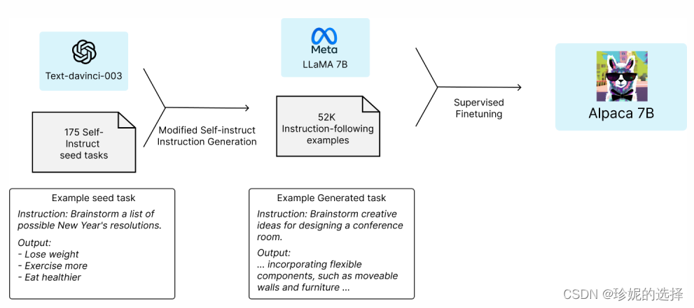 它使用 52K 个 intruction-following examples 来微调 Meta 的大语言模型 LLaMA 7B (Meta 开放了模型权重以及 Inference 代码,详见 https://github.com/facebookresearch/llama),从而生成了 Alpaca 7B。