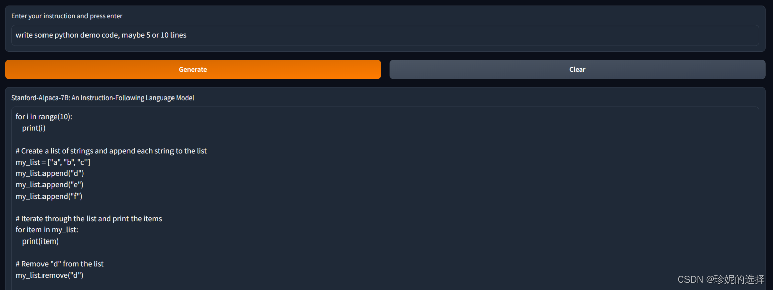 为了测试 Alpaca 的连续对话能力,我仍然从代码的角度进行提问;我首先让它写非常简单的 python 代码,可能 5 ~ 10 行的样子,它顺利的完成了: