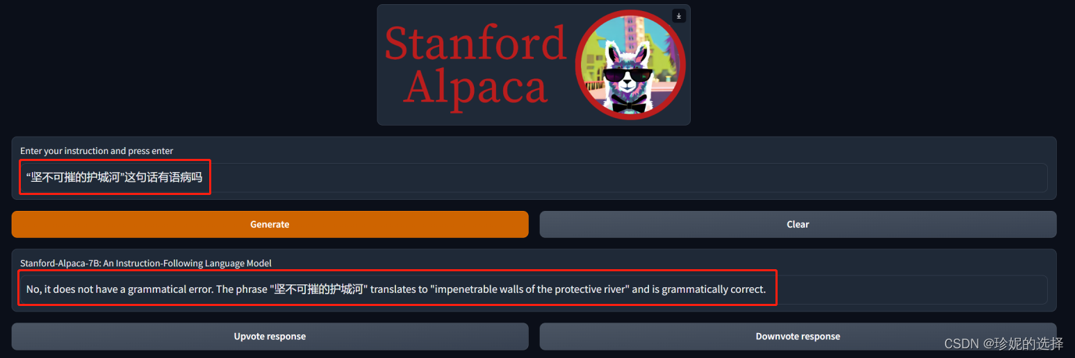 第一个红框中输入我的问题,第二个红框是 Alpaca 的回答,它不仅指出 “坚不可摧的护城河” 没有语病,还把这句话翻译了一下。保险起见我还到 Google 中搜了一下,确认有句子是这样用的,那我只能默认它是对的 🤣。