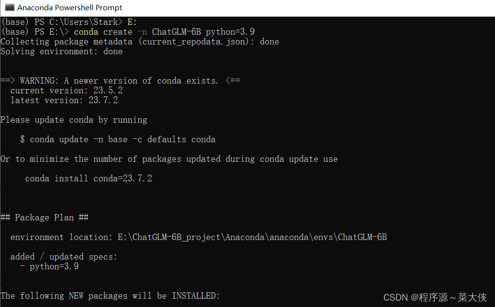 之后输入命令: conda create -n ChatGLM-6B python=3.9。
