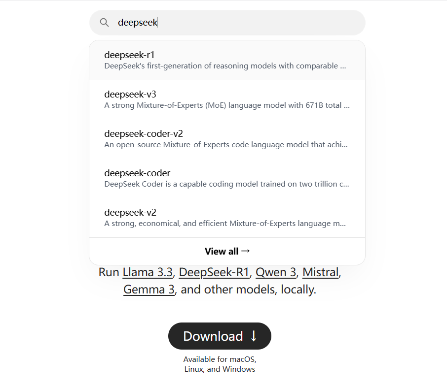 安装完成后还在官网页面,在正上方的搜索框中搜索想要安装的版本,这里以deepseek-r1为例: