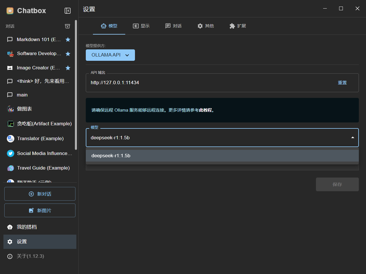 安装成功后在左下角的设置中配置模型提供方为OLLAMA API,域名固定为图中的http://127.0.0.1:11434 配置完成后保存即可。