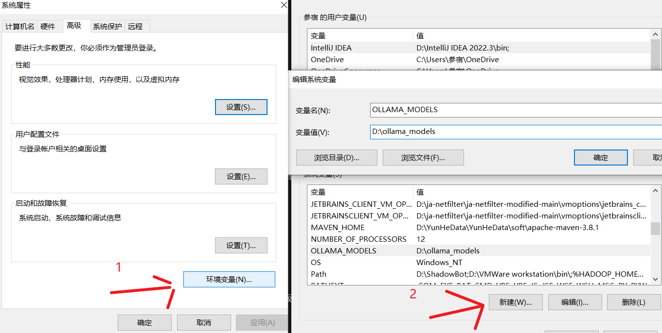 在系统变量里面新建环境变量,将变量起名为OLLAMA_MODELS(全大写),变量值为自己安装的模型的路径。