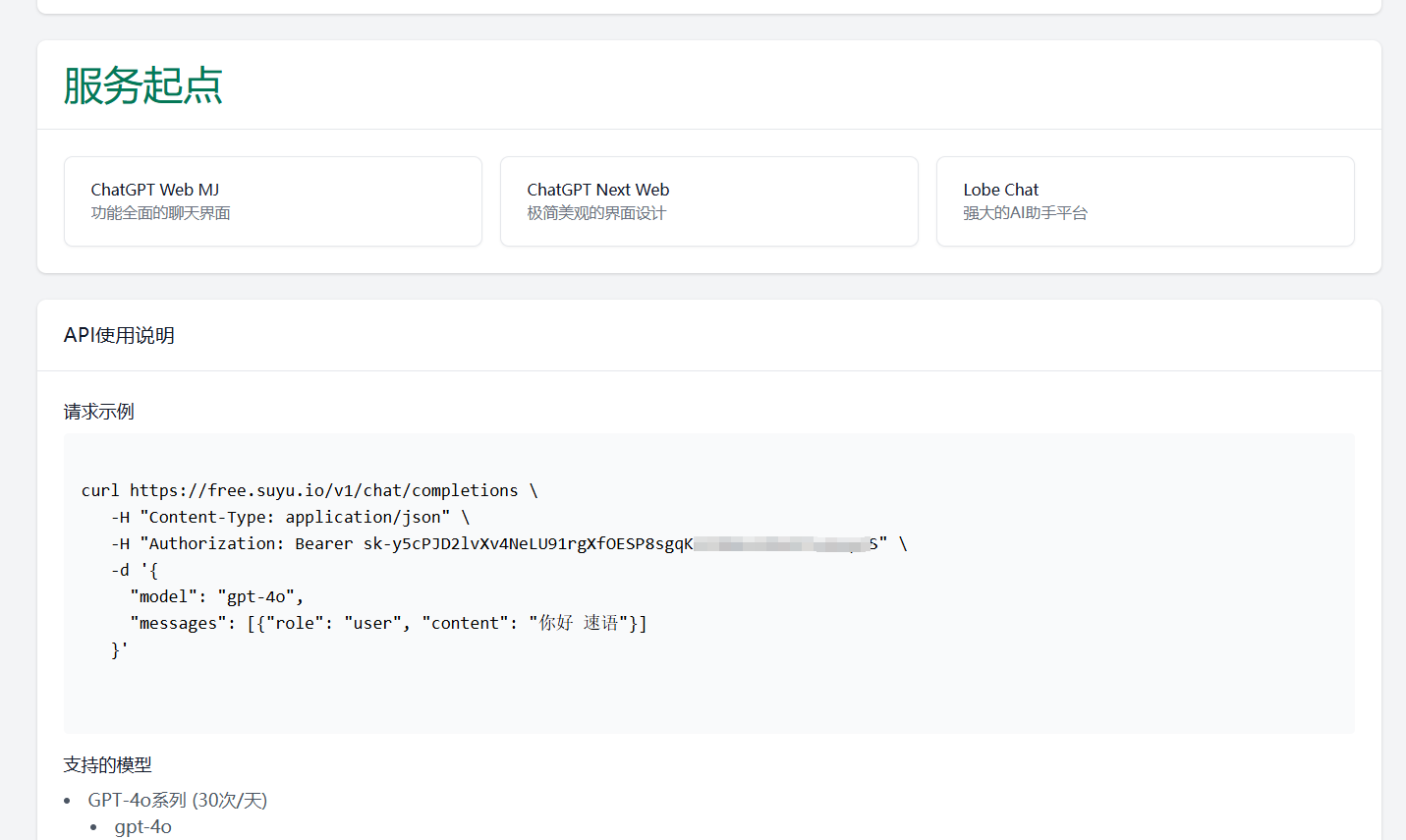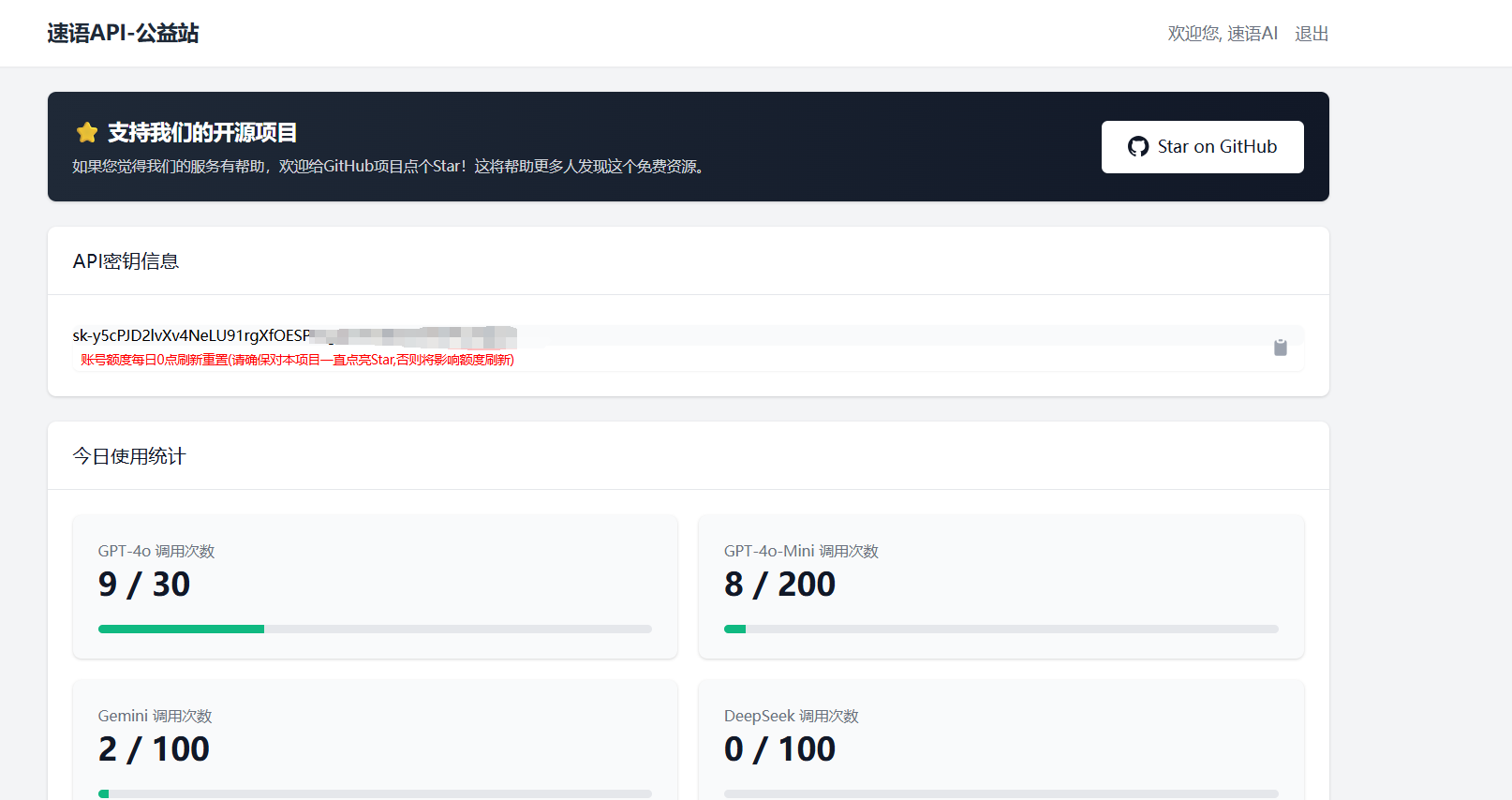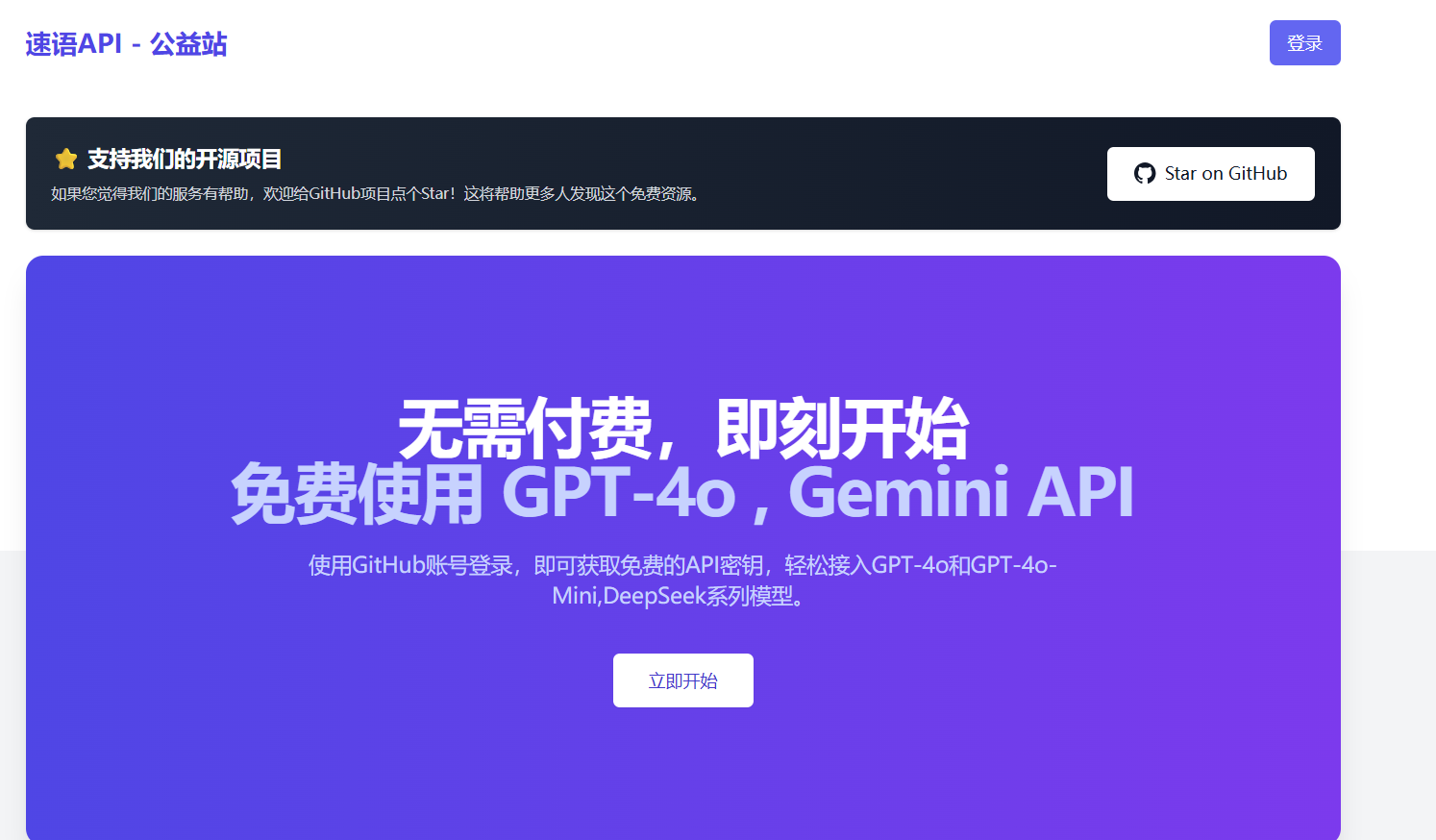速语AI公益站提供免费AI API服务,支持GPT-4o(30次/日)、GPT-4o-Mini(200次/日)、Gemini(100次/日)和DeepSeek(100次/日)等多个模型系列。用户通过GitHub登录并Star开源项目后即可获取API密钥,可使用镜像站点https://free.suyu.io接入服务。该平台旨在让开发者轻松使用最新AI能力。