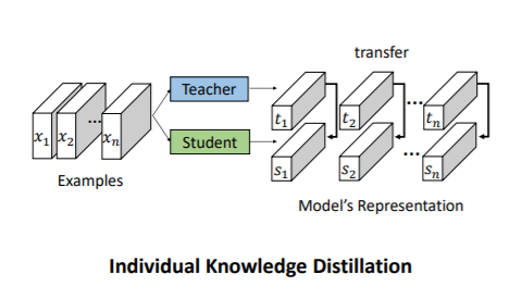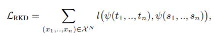为了使得小模型能够更好的学习到大模型的结构信息,本文提出了关系型蒸馏学习法(RKD),如下图所示,RKD算法的核心是以多个教师模型的输出为结构单元,取代传统蒸馏学习中以单个教师模型输出为检测的方式,利用多输出组合成结构单元,更能体现出教师模型的结构化特征,使得学生模型得到更好的指导。
