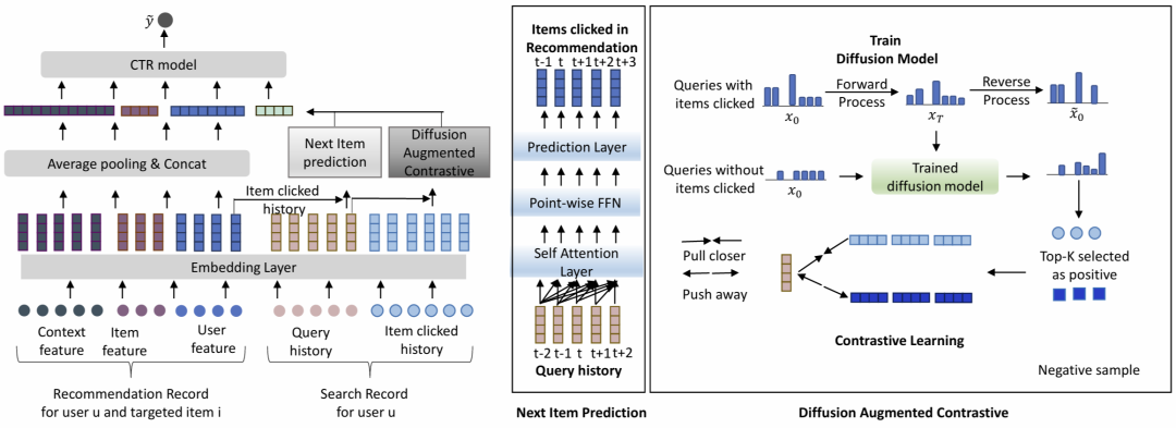 许多平台(例如电商网站)同时提供搜索和推荐服务,以更好地满足用户的多样化需求。推荐服务基于用户偏好为其推荐商品,而搜索服务允许用户主动搜索商品,然后再提供推荐。由于用户和商品通常在搜索与推荐领域之间共享,这为利用搜索领域中提取的用户偏好来增强推荐领域提供了宝贵的机会。然而,现有方法要么忽视了用户在这两个领域之间意图的转变,要么未能捕捉到从用户搜索查询中学习对理解用户兴趣的重要作用。本文提出了一种框架,通过学习搜索领域中的用户搜索查询嵌入(query embedding),增强推荐领域中的用户偏好建模。具体而言,我们利用搜索领域中的用户搜索查询序列来预测用户在推荐领域中下一时刻可能点击的商品。此外,通过对比学习探索查询与商品之间的关系。为了解决数据稀疏性问题,我们引入扩散模型,以一种去噪的方式推断用户在特定查询后可能选择的正样本商品,从而有效避免误报问题。在有效提取这些信息后,我们将查询信息融入推荐领域中的点击率(CTR)预测中。实验分析表明,所提出的模型在推荐领域中的表现优于现有的最新模型。