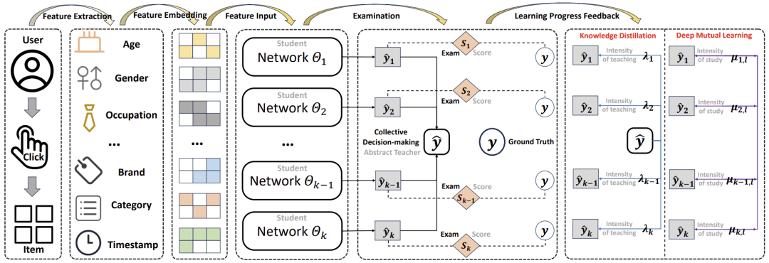 点击率(CTR)预测在推荐系统和网页搜索中起着至关重要的作用。尽管现有的许多方法通过集成学习(Ensemble Learning)提升模型性能,但通常将集成的规模限制在两到三个子网络,对更大规模集成的探索较少。在本文中,我们研究了更大规模集成网络的潜力,并发现常见集成学习方法存在以下三个固有局限性:(1)子网络数量增加时性能下降;(2)子网络性能急剧下降且波动较大;(3)子网络预测结果与集成预测结果之间存在较大差异。为同时解决上述问题,本文从知识蒸馏(Knowledge Distillation, KD)和深度互学习(Deep Mutual Learning, DML)的角度探索潜在的解决方案。基于这些方法的经验性表现,我们提出了一种新颖的、与具体模型无关的集成知识迁移框架(Ensemble Knowledge Transfer Framework, EKTF)。具体而言,我们利用学生网络的集体决策作为抽象教师(Abstract Teacher),指导每个学生网络(子网络)进行更高效的学习。此外,我们鼓励学生网络之间的互学习,从不同的视角获取知识。为了解决损失函数中超参数平衡的问题,我们设计了一种新颖的考核机制,以确保教师对学生的定制化教学,以及学生间的选择性学习。在五个真实数据集上的实验结果表明,EKTF 在有效性和兼容性方面均优于现有方法。