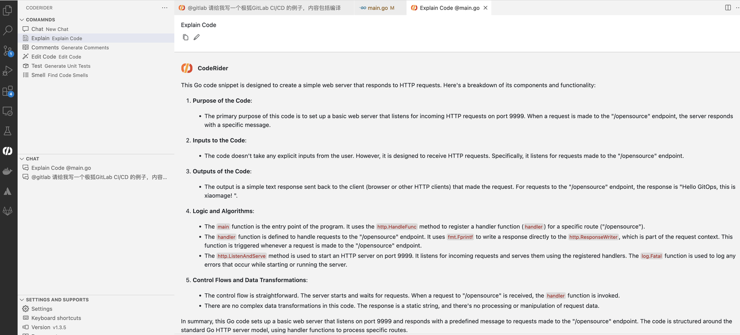 - 右键选中代码 → 选择 CodeRider: Explain Code,或通过命令面板调用。