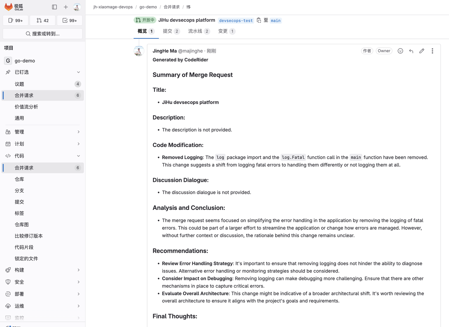 4.可以直接在极狐GitLab 项目中查看评论是否被添加到 MR 中: