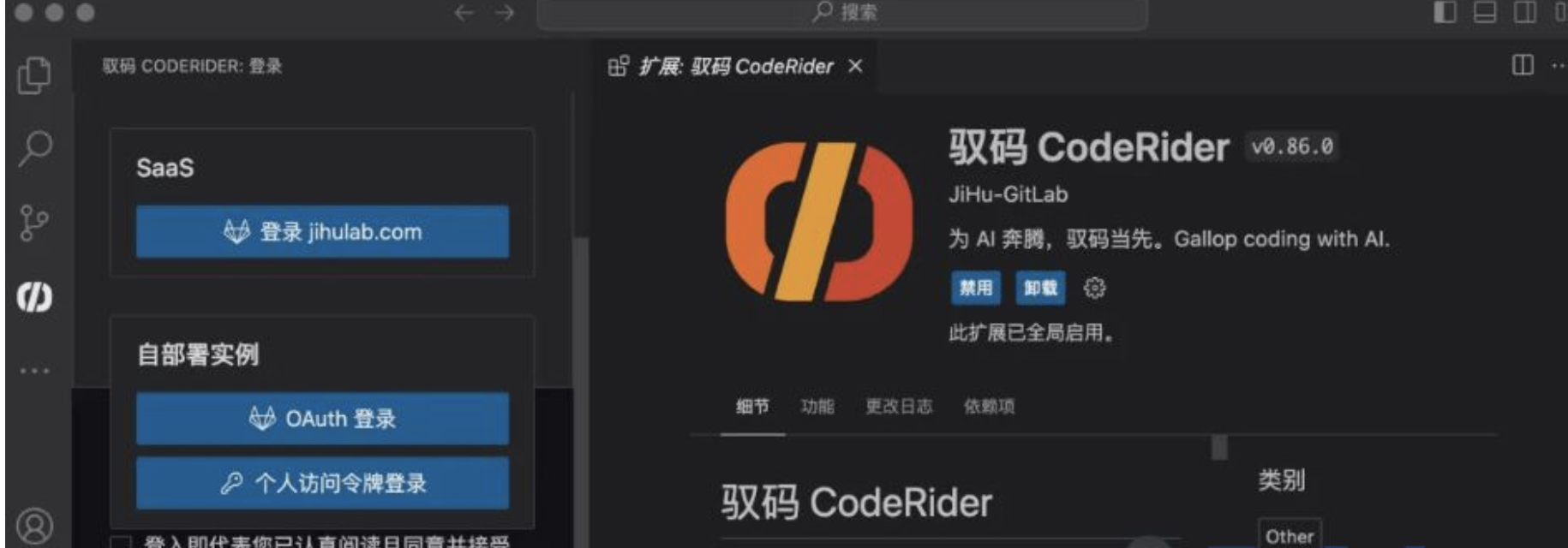 - 在扩展市场的搜索框中输入 “驭码 CodeRider”。