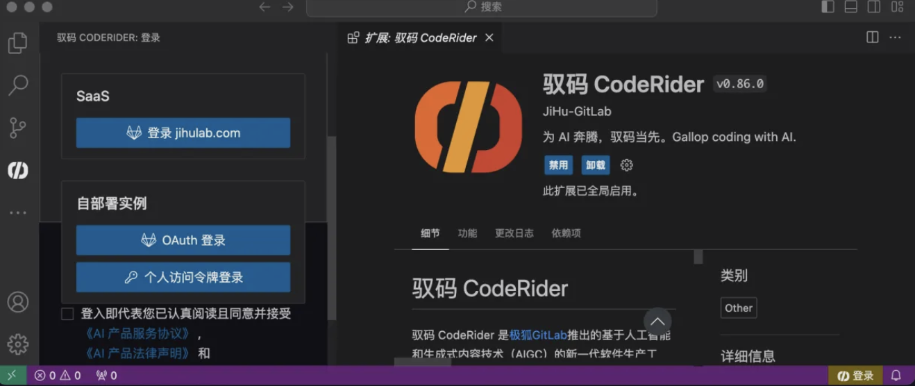 您描述的是使用 驭码CodeRider 插件在 VSCode 中结合 极狐GitLab 进行代码分析和单元测试生成的完整流程。以下是分步详解: