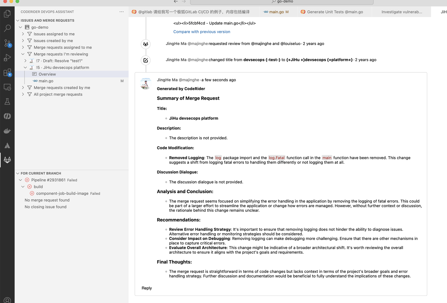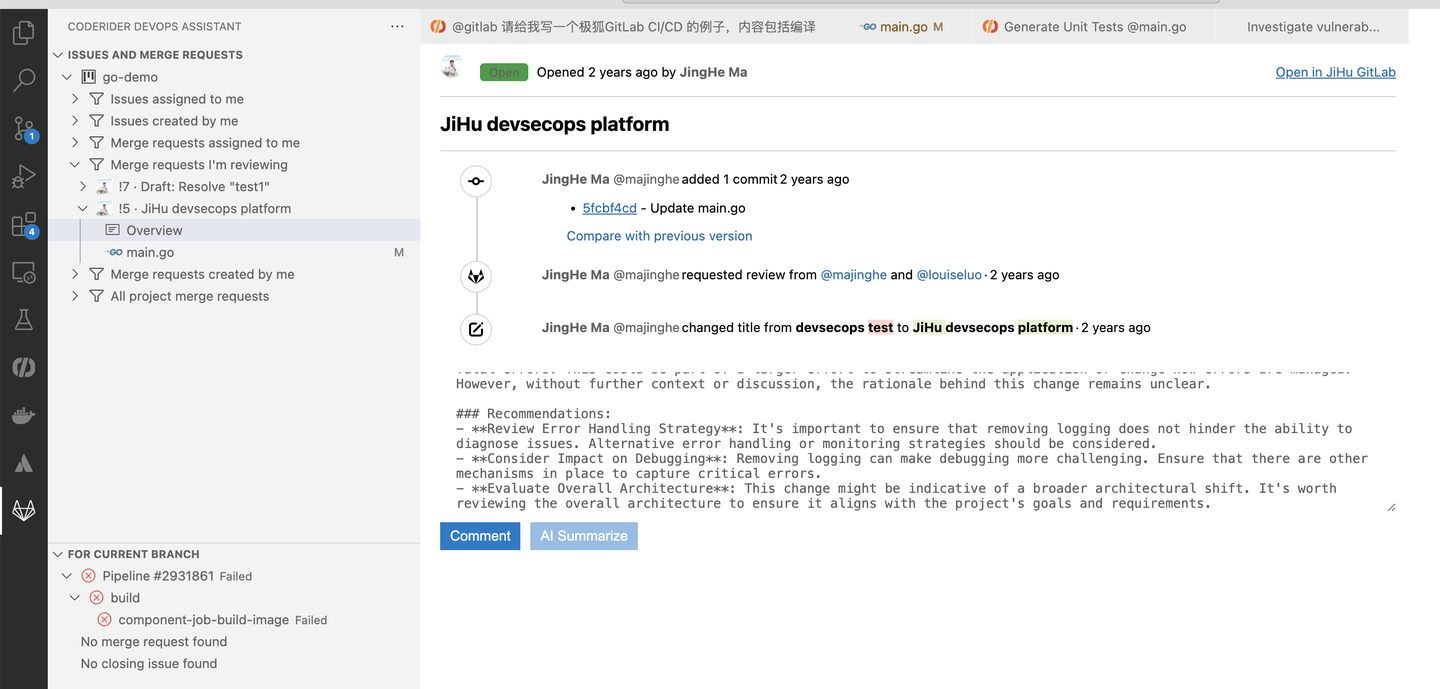在合并请求环节,传统的代码审查需要逐行比对差异,现在通过智能合审功能,系统会自动生成包含代码修改前后对比的摘要报告(如图2)。上周审查一个包含32个文件变更的MR时,这项功能帮我发现了3处潜在的类型错误。
