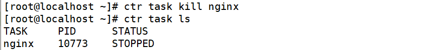 杀死容器,ctr 没有 stop 容器的功能,只能暂停或者杀死容器
