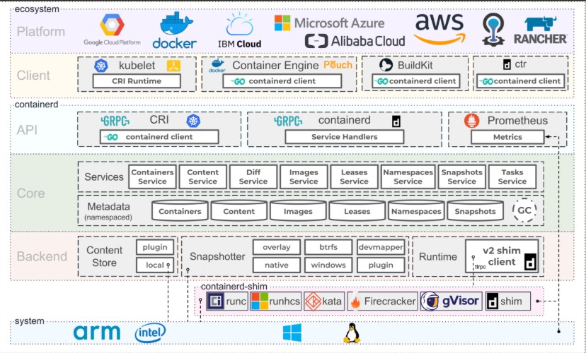 - 跨平台支持:Containerd 可以在不同的操作系统上运行,从而提供了跨平台的支持。