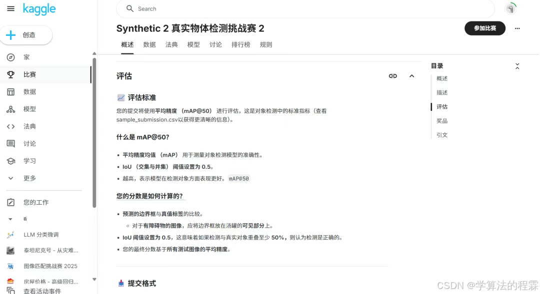 选择一个感兴趣的比赛后,里面有关于比赛概述、具体描述、评估标准、相关奖品等等,大家在参加比赛前务必要仔细阅读评估指标和提交要求,最后点击【Join competition】即可报名比赛。