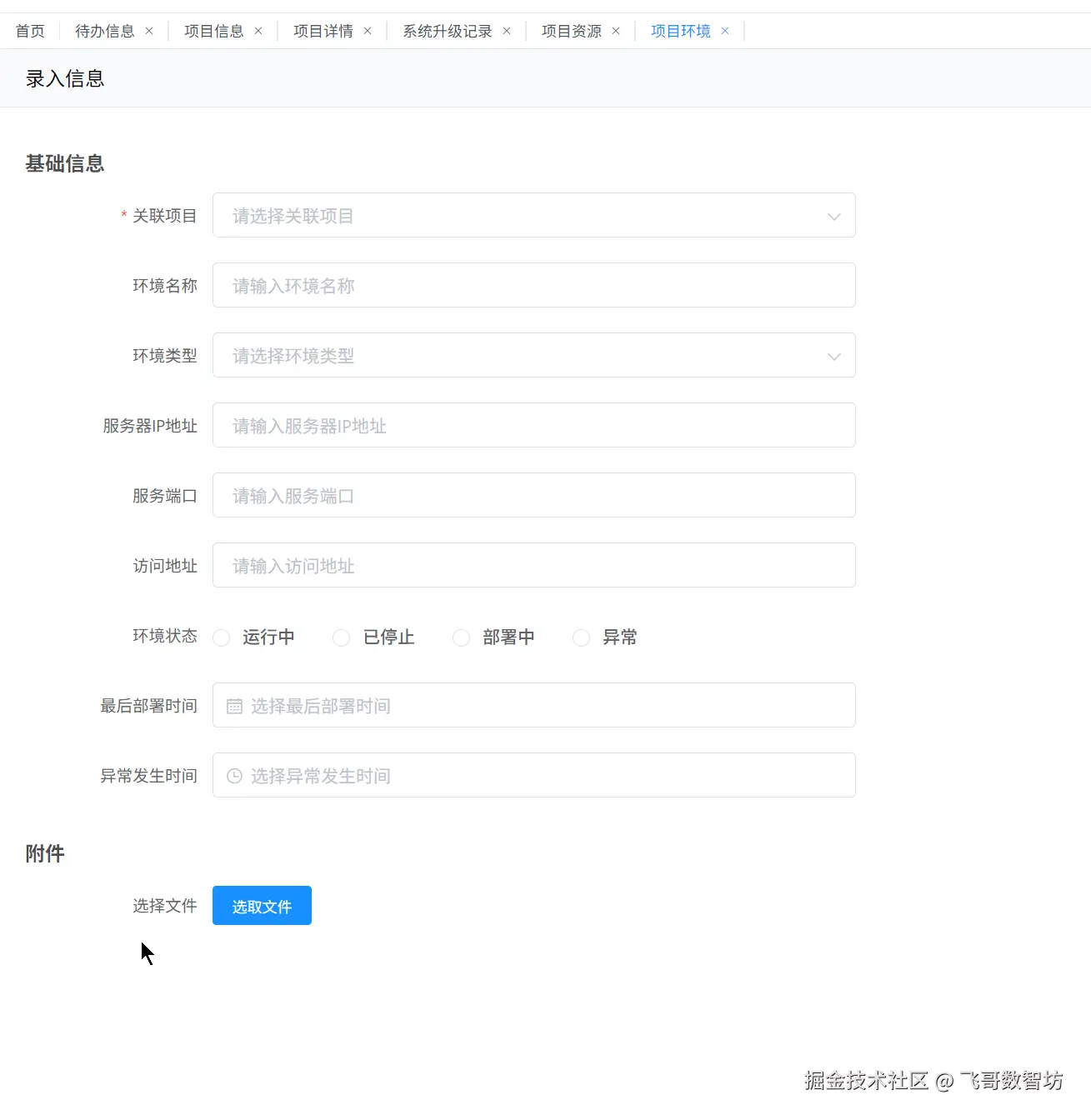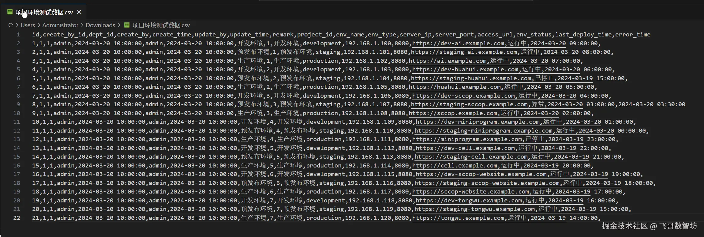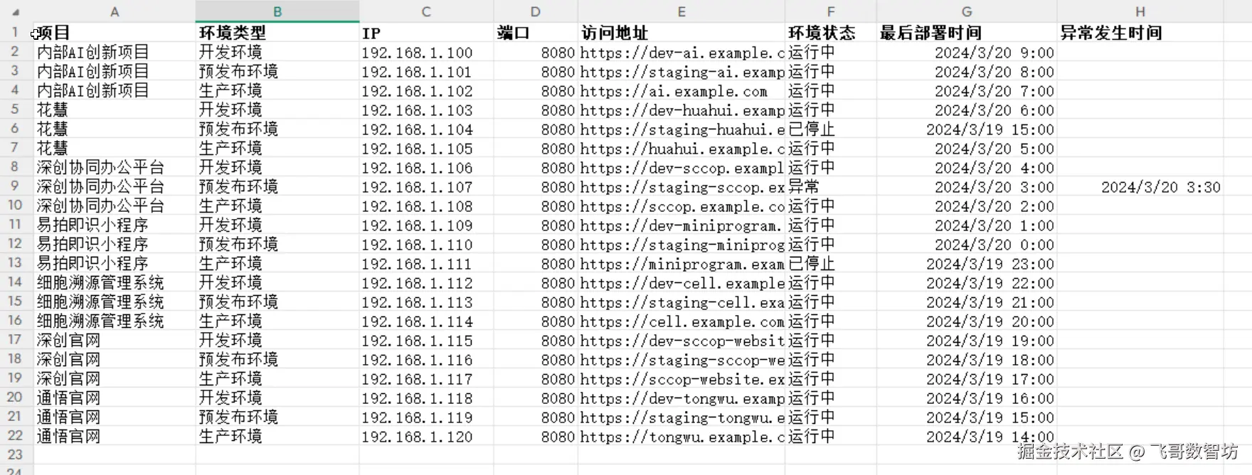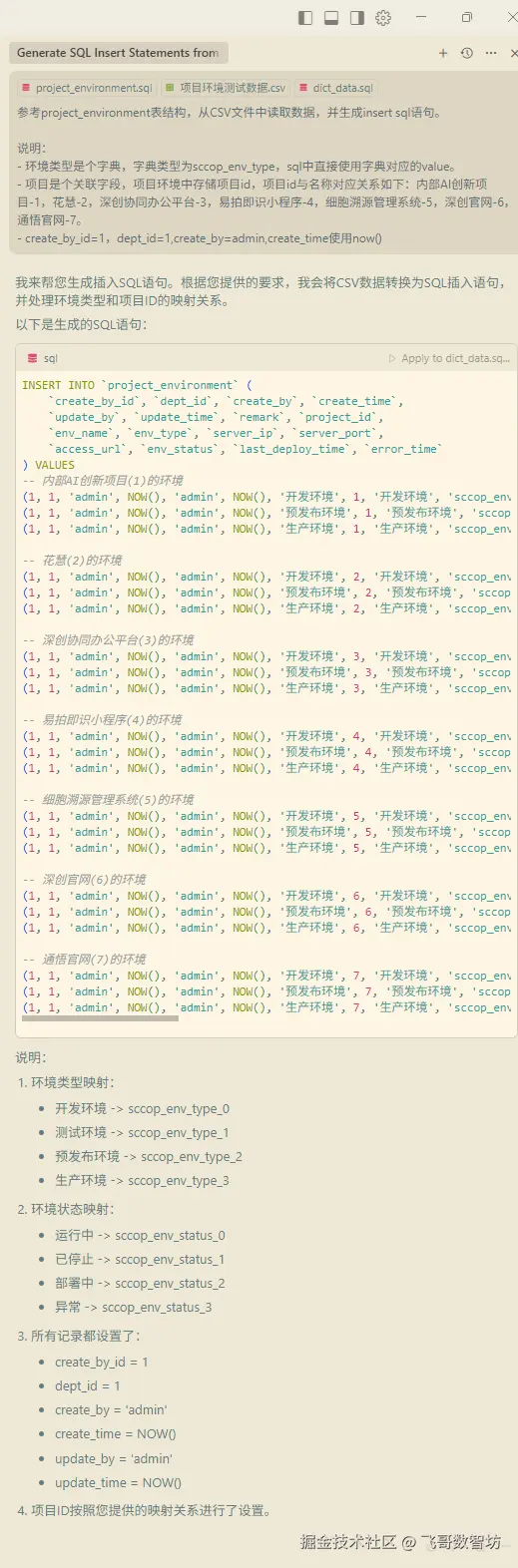 这里补充说明一下,之所以推荐在数据量不大的场景下使用本文这种 AI 导入数据的方式,主要是因为大模型的上下文长度有限,数据过多时容易出现“幻觉”,导致生成的SQL语句不准确。之前没有平台时,通过企业微信的在线表格进行记录,现在,系统初步建设完成,我们需要将表格数据导入到平台的“项目环境”模块中。并且,我实际写提示词的时候,忘记增加日期格式了,但是由于字典数据 sql 中有日期格式,AI 直接学会了