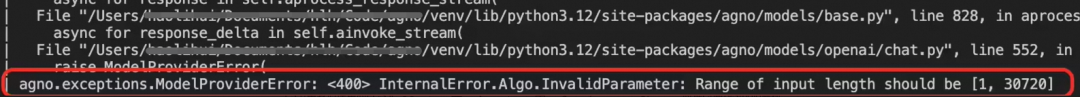 1.3节中我们使用的ECS MCP Server有26个工具,在使用全量工具集、模型为Qwen-max的时候CherryStudio会报“超出上下文长度限制”的错误。在Agno中,报错类似: