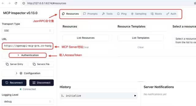 使用方式:本地窗口运行“npx @modelcontextprotocol/inspector”,该命令会从远端拉取服务并在本地运行,通过浏览器打开“Http://127.0.0.1:6274”来使用。