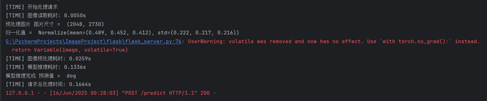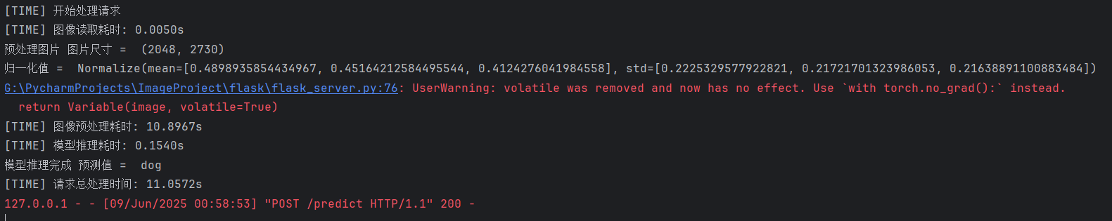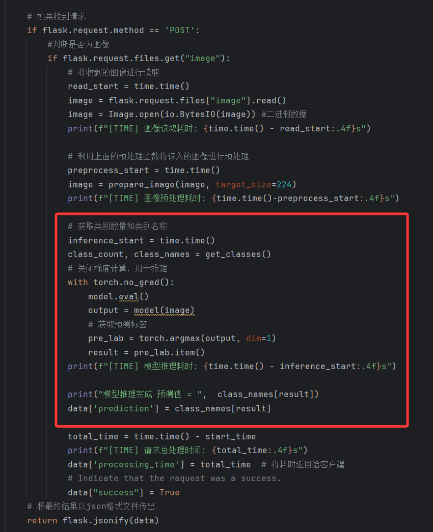 当收到网络请求时,server会依次进行图像读取->图像预处理->模型推理->数据组装与返回。其中模型推理代码与上一篇文章中的推理环节完全相同,这里不加赘述。