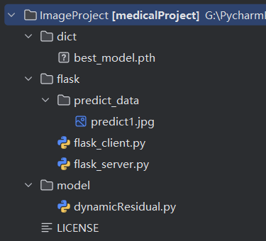 相关工程目录如图所示,flask_client.py是模拟客户端的代码,flask_server.py是模拟服务端的代码。predict1.jpg是我们用来推理的图片。客户端代码会将该图片通过网络请求传到服务端,服务端再进行算法推理。