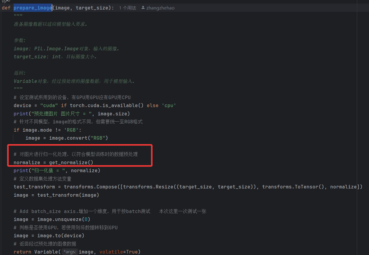 当收到客户端的请求时,先将传来的图片进行预处理。这里注意,在归一化处理流程中,归一化需要的mean和std值需要与训练阶段的值相同,效果才最好。