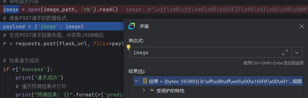 后面我们构建一个字典,将image对象作为一个value存放在字典内。再通过post请求将该字典数据发送到指定的服务器地址上。