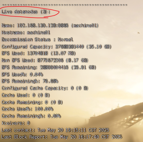 正常来说在Live datanodes后可以看到数量,且这个数量应与集群数量一致