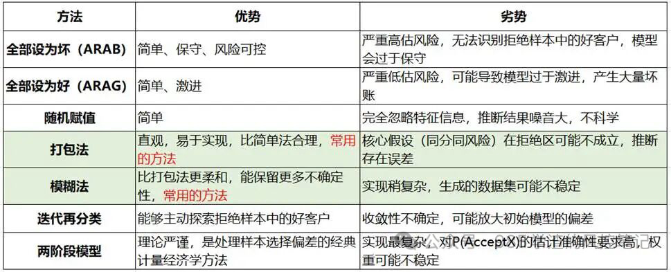 5.数据质量要求:拒绝推断的效果严重依赖于申请特征数据的质量。如果拒绝样本的特征数据缺失严重或质量差(因为当初未被认真处理),那么任何高级方法都将失效。