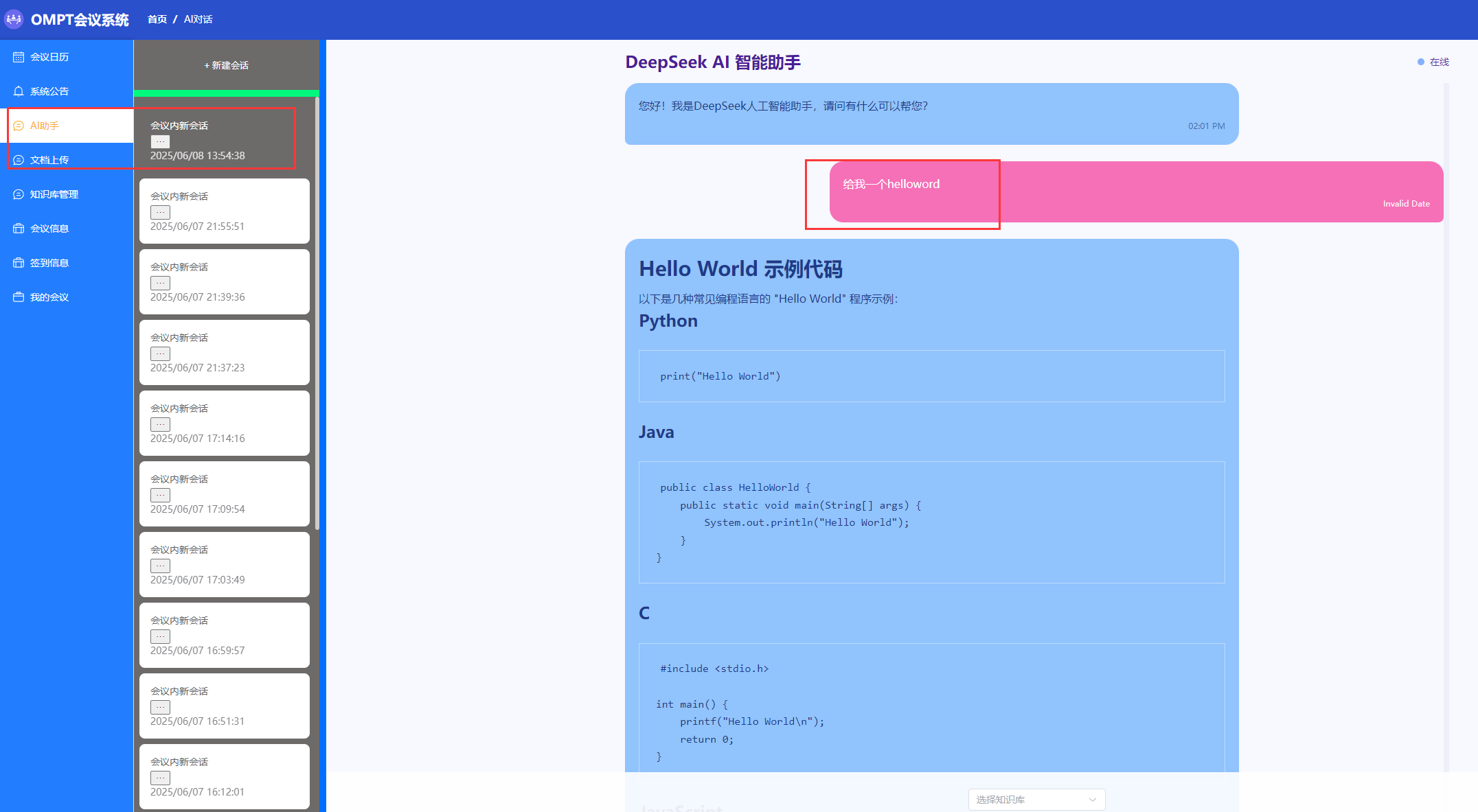 实现了会议内会话(Session)的自动创建与更新,确保会议内外Session数据统一存储于数据库。通过完善的前后端接口(如新增会话、更新会话),每个对话及其历史均能够进行有效存储与加载,用户可随时回顾历史对话或切换会话场景。可以再会议外部对会话历史进行管理,可以修改、继续提问、删除等操作。