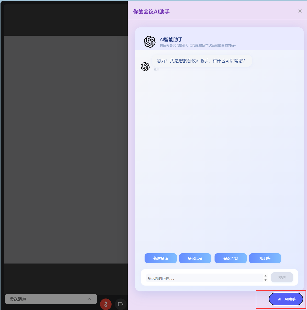 随着线上会议平台智能化需求的提升,单纯依靠会议记录或手动问答已无法高效满足参会人员随时查询、回顾与理解会议内容的需求。因此,本周项目的核心目标是设计并实现会议内AI助手框架,主要包括AI助手抽屉、AI实时对话功能(支持流式输出、历史对话回顾与管理、会议内外Session数据统一存储),以及用户与AI助手的交互头像设计。通过该框架,实现参会人员与智能助手更自然、更高效的互动,提升会议体验与效率。
