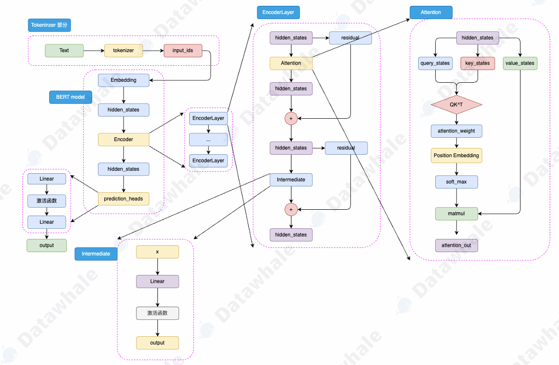 在BERT模型中,输入的文本(Text)首先通过tokenizer(分词器)转化为input_ids,然后进入Embedding层转化为特定维度的hidden_states,再经过Encoder层,这里的Encoder层是多个Encoder_Layer堆叠构成的,通过Encoder编码够的最顶层hidden_states最后经过prediction_heads得到最后的类别概率,经过Softmax输出得到计算模型预测的类别。