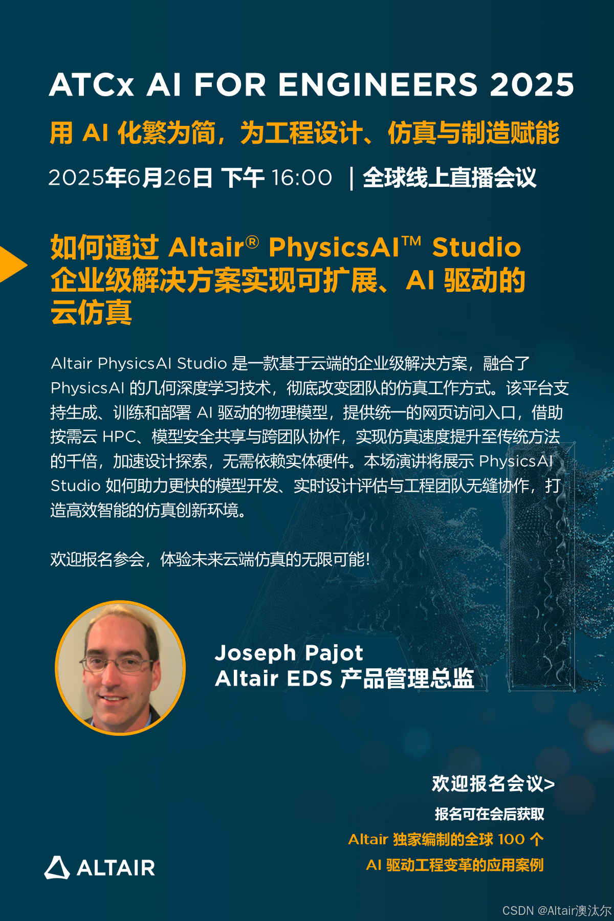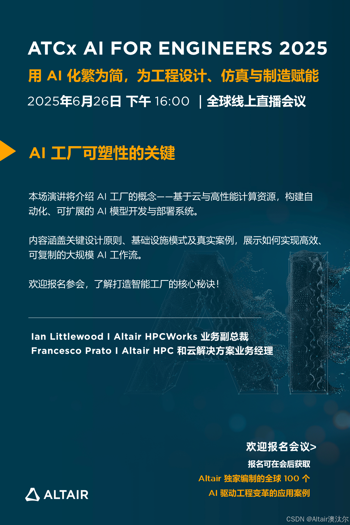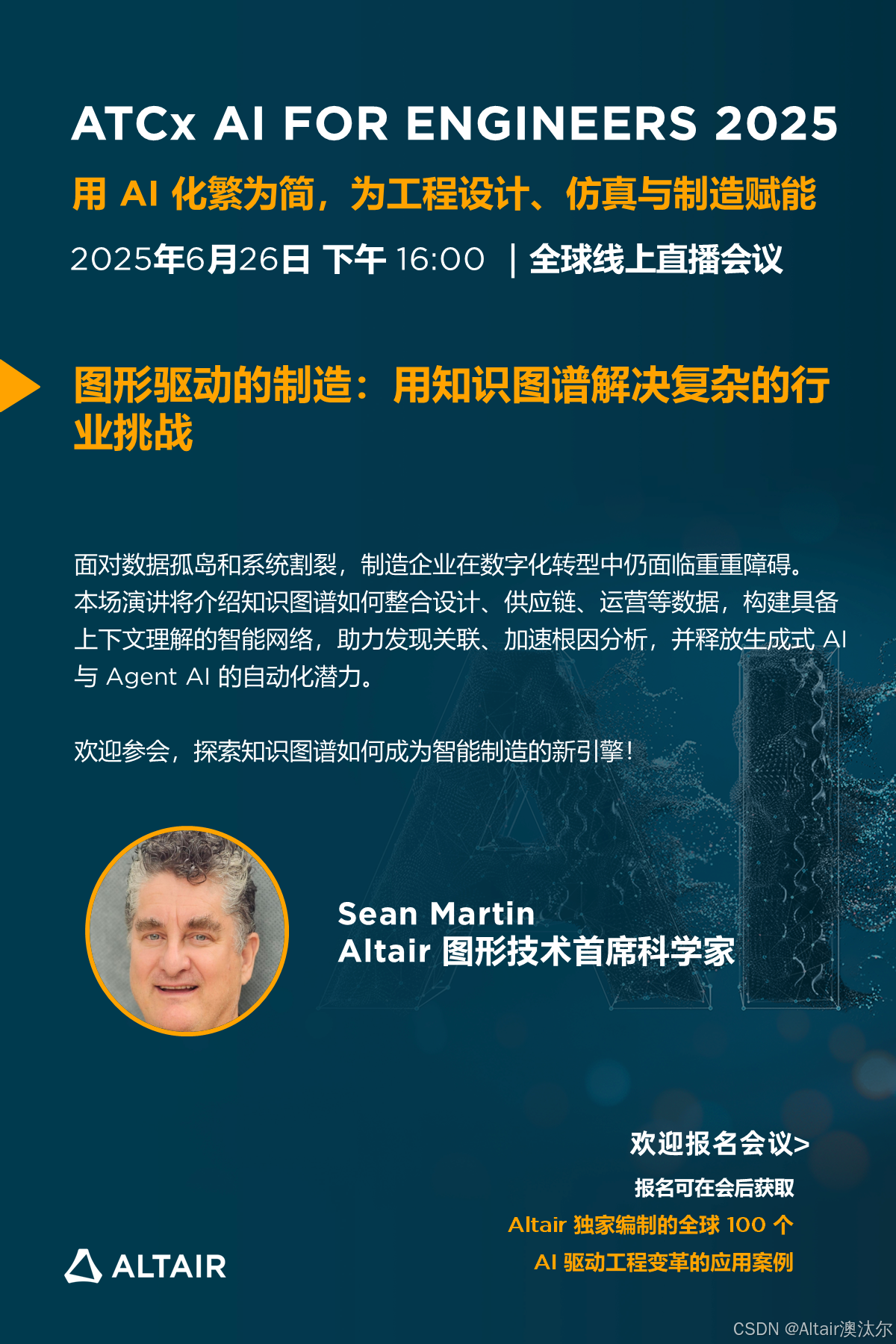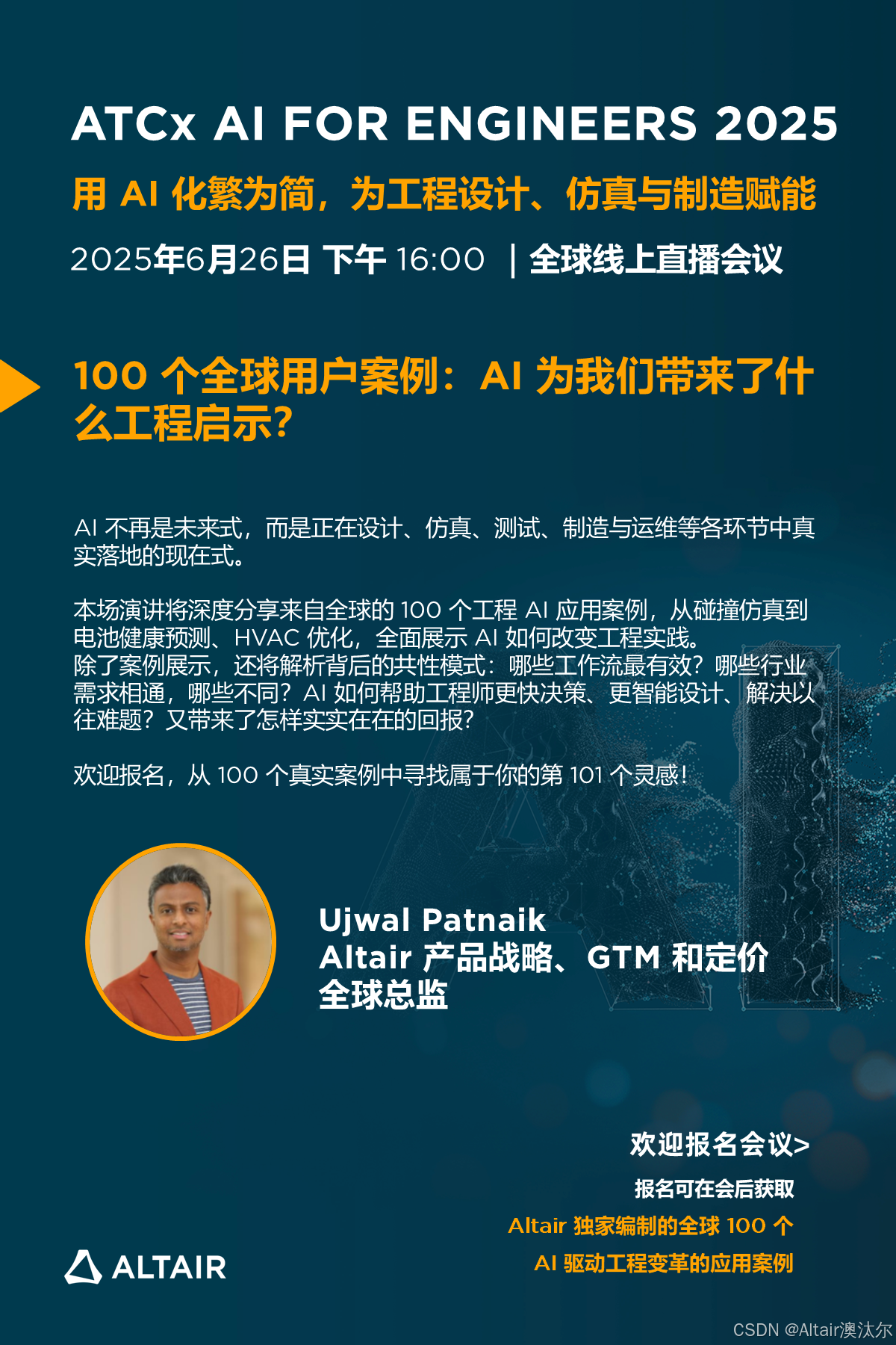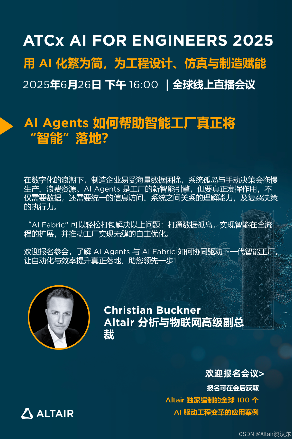 2025 年 6 月 26 日,Altair 将于线上举办面向广大工程师的全球线上会议 “AI for Engineers” 。会议将深度解析 AI 在产品开发、制造和高性能计算 (HPC) 领域的实际应用,包括:AI 赋能智能制造、AI驱动的智能工程、AI 助力不同学科的仿真、AI Agent、数字孪生与结果预测、知识图谱助力制造业创新等前沿议题。无论您是想加快仿真速度、简化生产流程,还是想更快