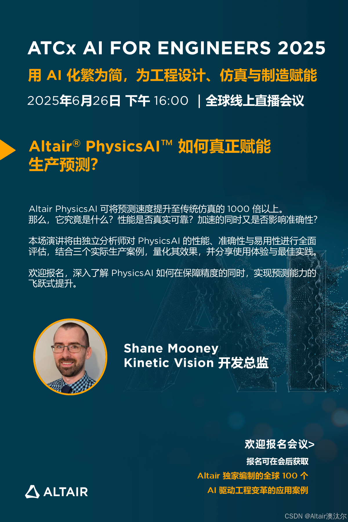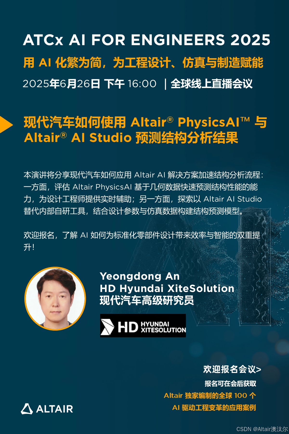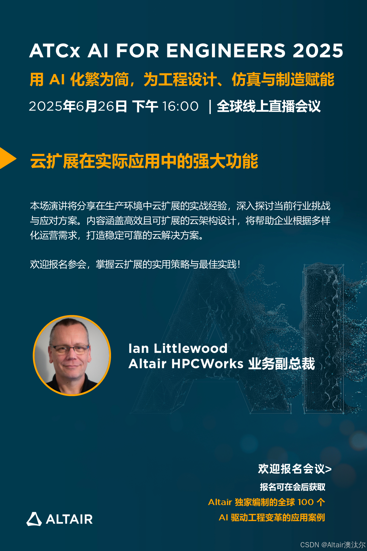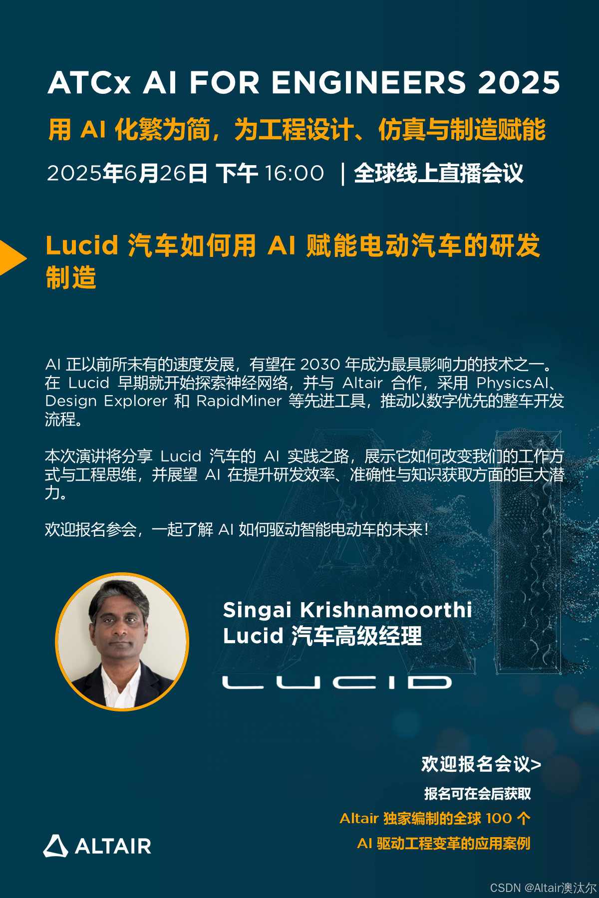 2025 年 6 月 26 日,Altair 将于线上举办面向广大工程师的全球线上会议 “AI for Engineers” 。会议将深度解析 AI 在产品开发、制造和高性能计算 (HPC) 领域的实际应用,包括:AI 赋能智能制造、AI驱动的智能工程、AI 助力不同学科的仿真、AI Agent、数字孪生与结果预测、知识图谱助力制造业创新等前沿议题。无论您是想加快仿真速度、简化生产流程,还是想更快