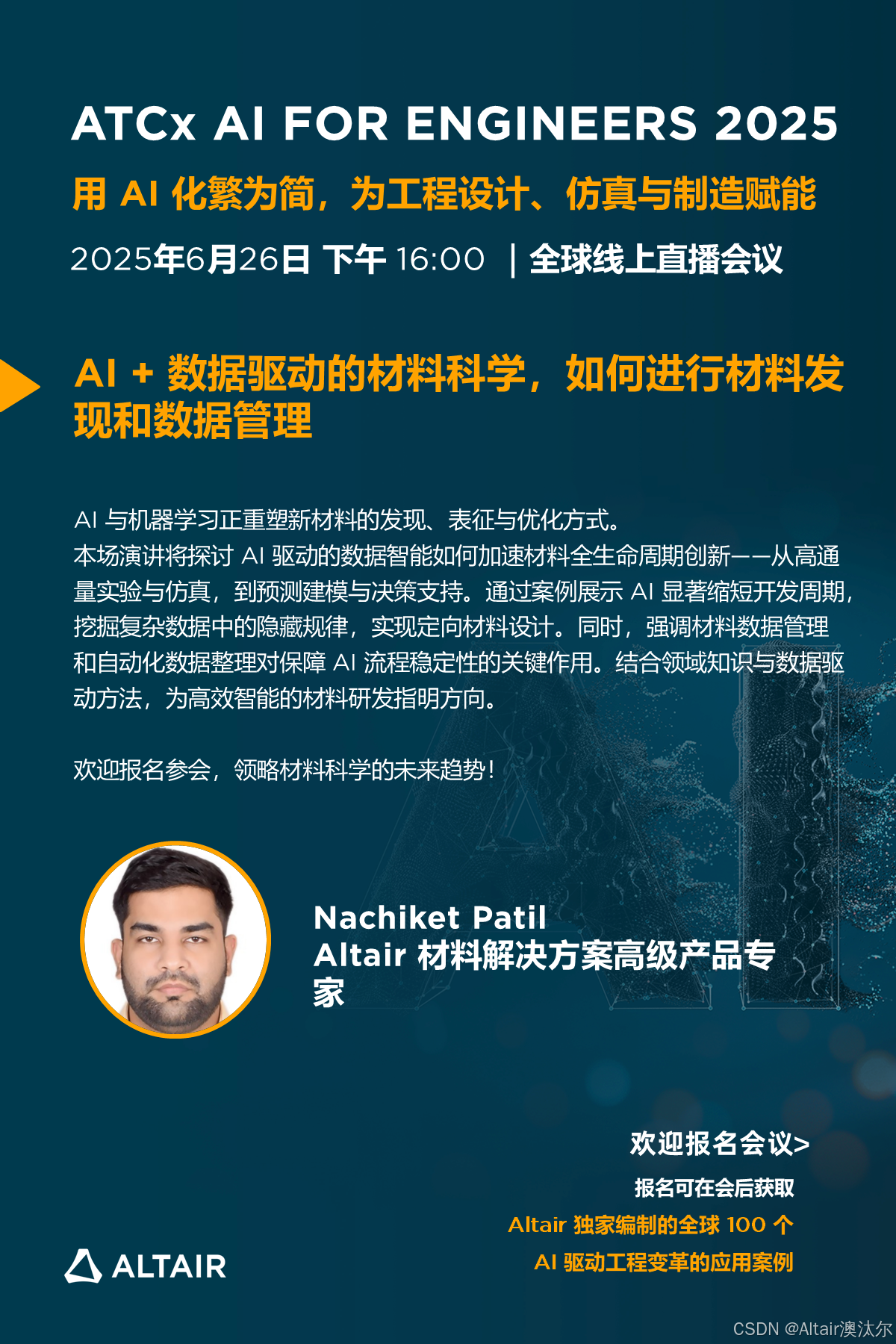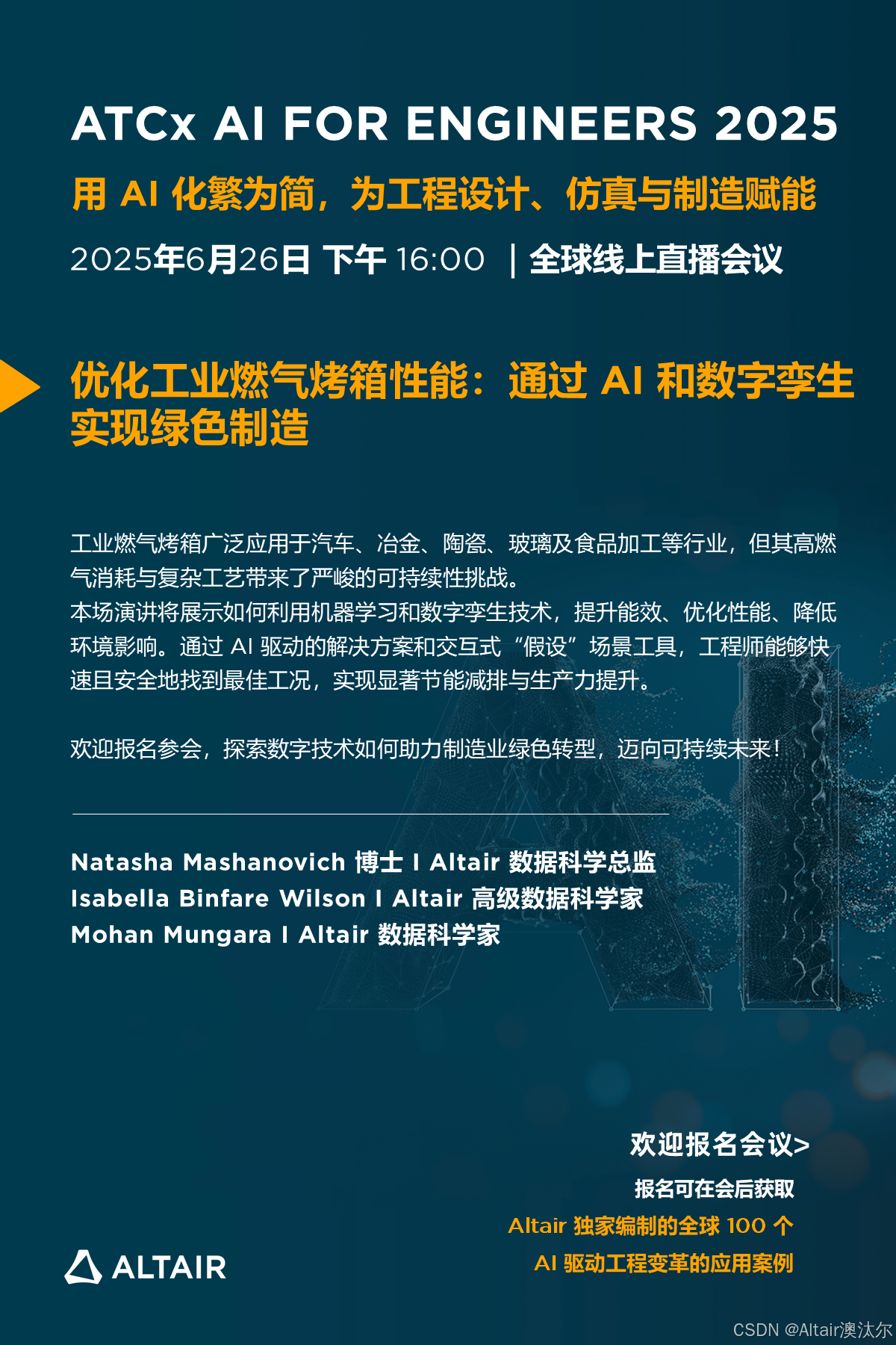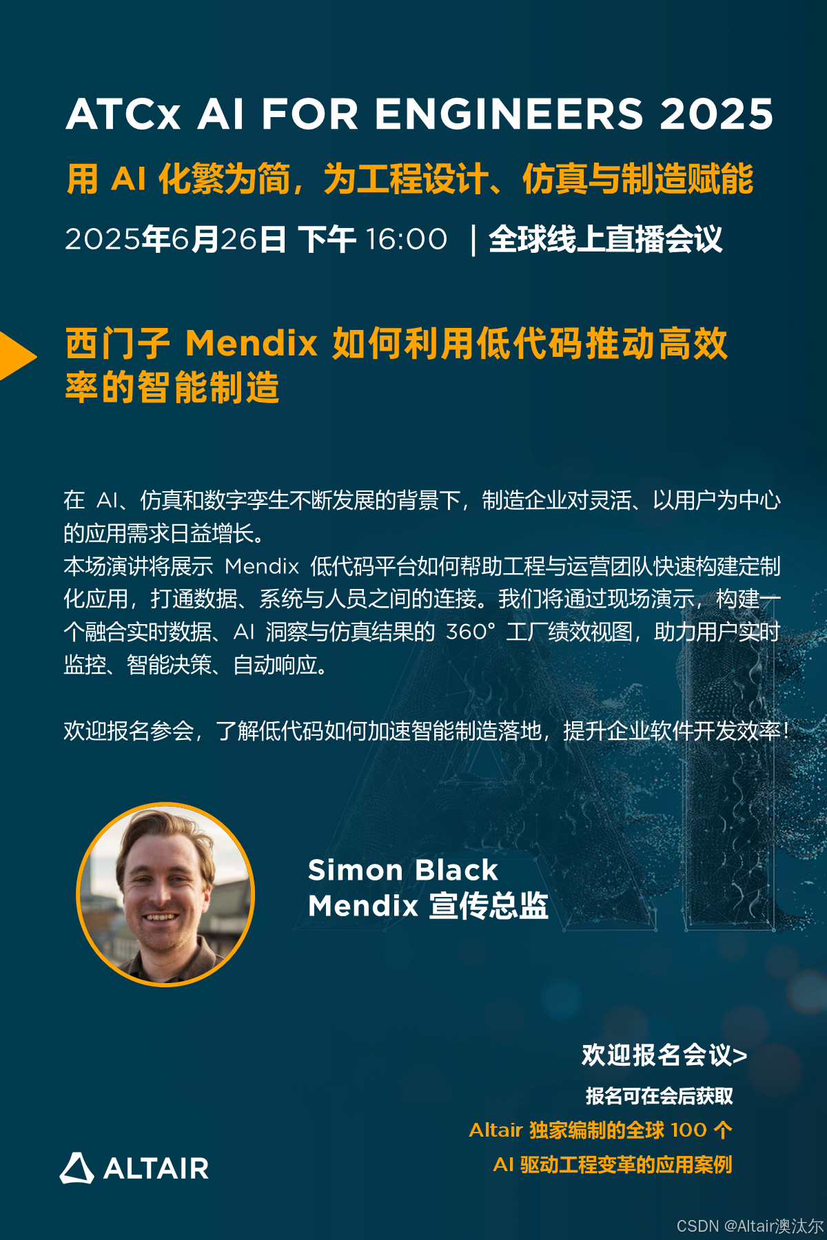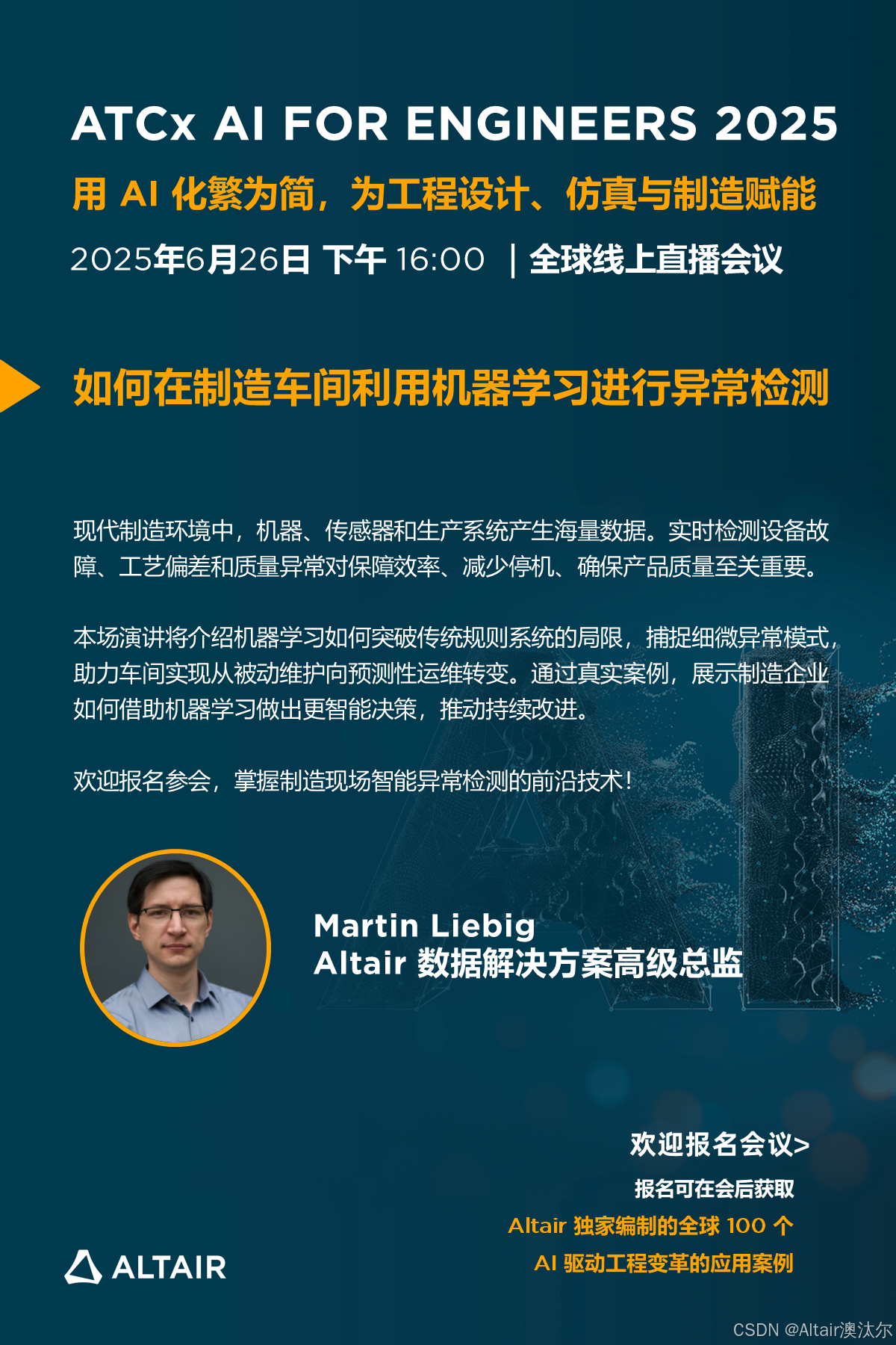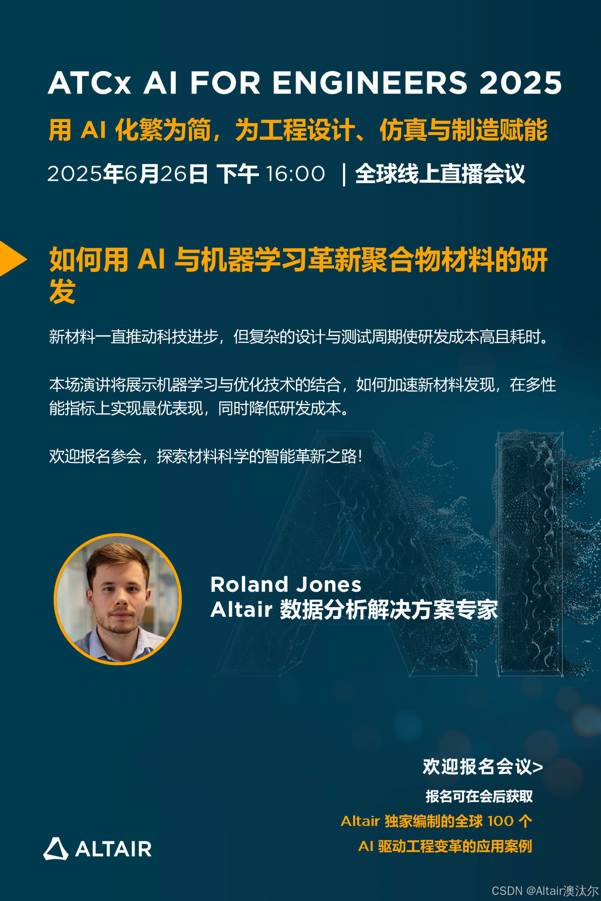 2025 年 6 月 26 日,Altair 将于线上举办面向广大工程师的全球线上会议 “AI for Engineers” 。会议将深度解析 AI 在产品开发、制造和高性能计算 (HPC) 领域的实际应用,包括:AI 赋能智能制造、AI驱动的智能工程、AI 助力不同学科的仿真、AI Agent、数字孪生与结果预测、知识图谱助力制造业创新等前沿议题。无论您是想加快仿真速度、简化生产流程,还是想更快
