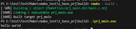 运行可执行程序,结果出现 **hello world **生成可执行程序 prj_main.exe。