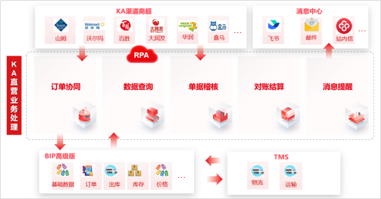 为了解决KA经营协同过程中效率低、易错漏、数据获取难、数据分析难等问题,企业实施KA经营协同系统,借助RPA技术,实现智能抓单、智能处理、高效协同、智能分析,下面是KA经营协同总体架构图:
