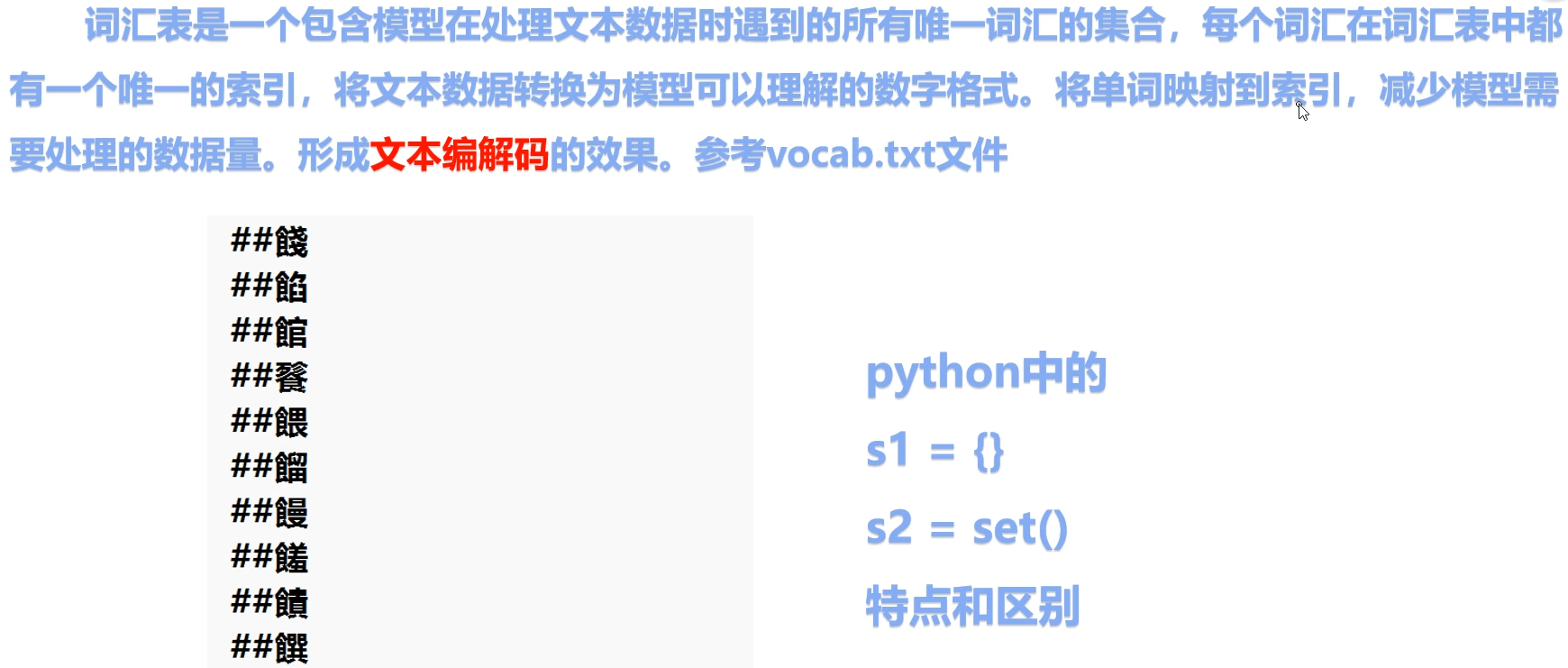 词汇表是一个包含模型在处理文本数据时遇到的所有唯一词汇的集合,每个词汇在词汇表中都有一个唯一的索引,将文本数据转换为模型可以理解的数字格式。将单词映射到索引,减少模型需要处理的数据量。形成文本编解码的效果。